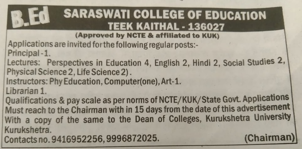 Faculty and other positions at the Saraswati College of Education are advertised in newspapers as well as displayed on this website. If you would like to be considered for a faculty position, please fill online application form and along with it also attach your updated C.V. Even if we do not have a position available your application will be kept on the file and we shall contact you as and when a position of your interest becomes available.